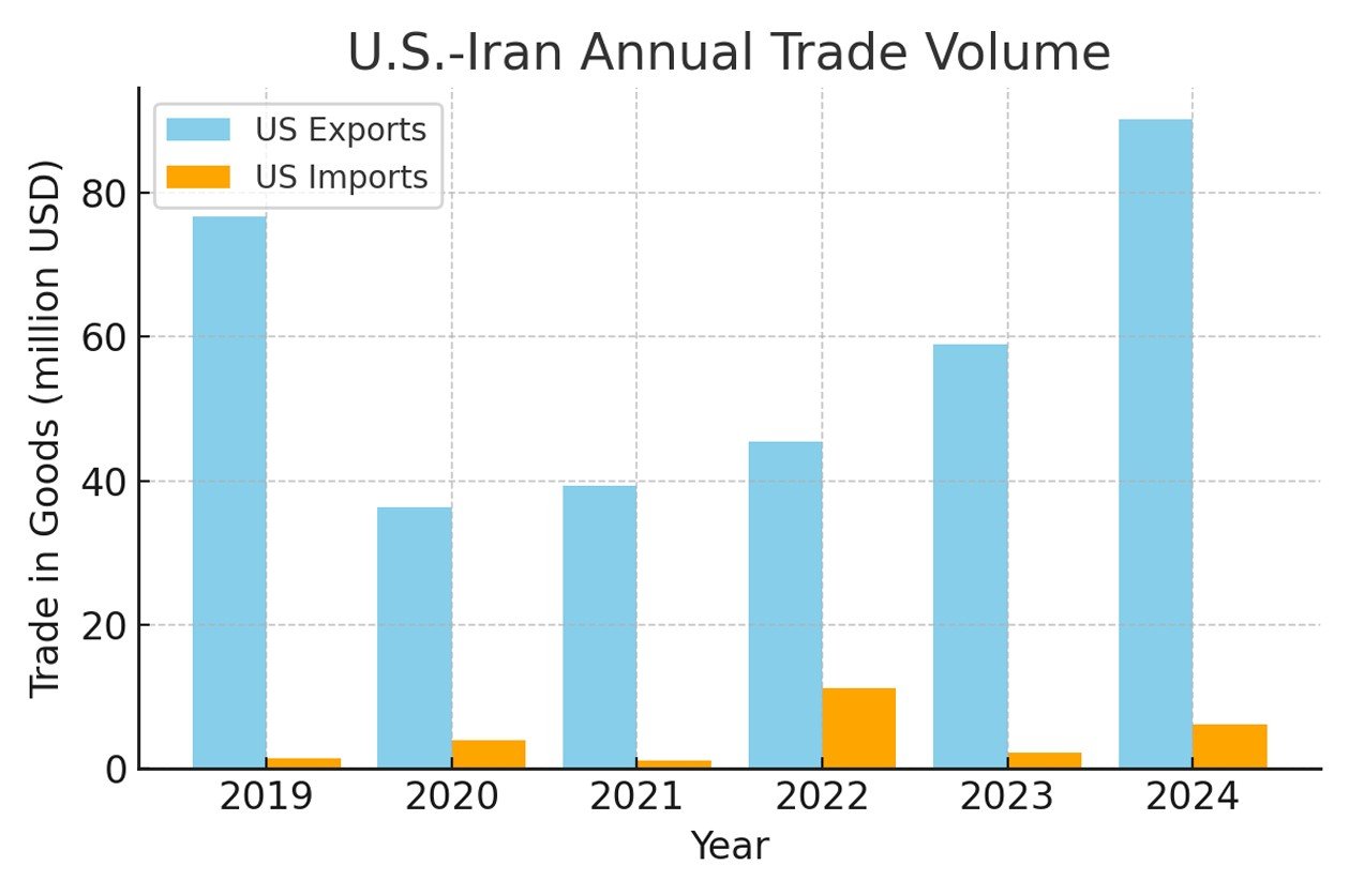 Figure: U.S.-Iran Annual Trade Volume, 2019–2024. U.S. Census Bureau data show the collapse of bilateral trade after 2018. Even humanitarian-related exports from the U.S. to Iran remain low (tens of millions USD), while U.S. imports from Iran are nearly zero 39 40 . A slight uptick in 2023–2024 reflects licensed medical exports and increased enforcement of reporting, but overall trade is negligible.