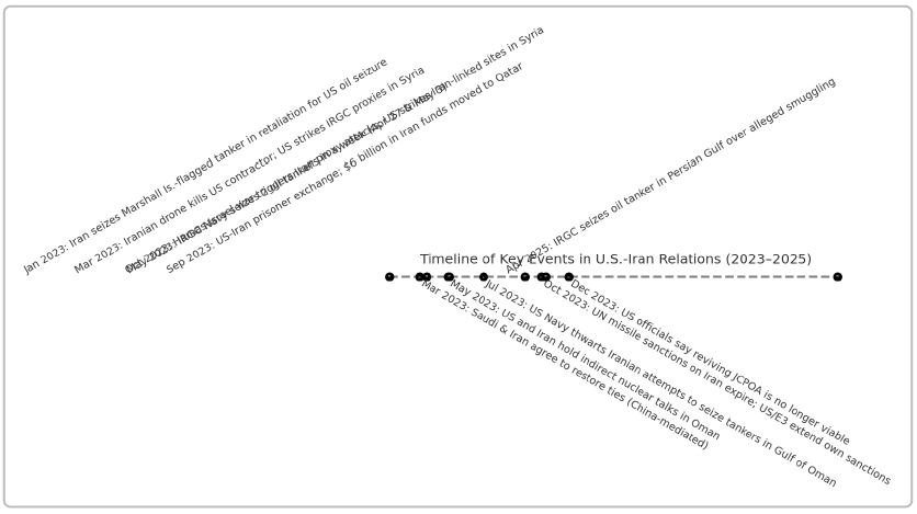 Figure: Timeline of Key Events in U.S.-Iran Relations (2023–2025). This timeline highlights notable incidents and diplomatic engagements. These include tanker seizures (Jan, Apr/May 2023, Apr 2025), proxy clashes in Syria (Mar 2023, Oct 2023), a China-brokered Saudi-Iran détente (Mar 2023), U.S.-Iran backchannel talks in Oman (May 2023), a prisoner swap (Sep 2023), and escalations around the Israel-Hamas war (Oct 2023). The timeline underscores the recurring pattern of maritime incidents and proxy confrontations, even as diplomatic efforts intermittently occur.