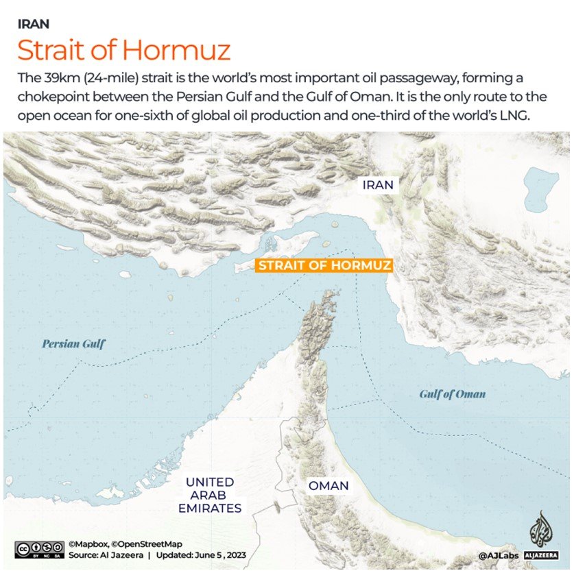 Figure: Map of the Strait of Hormuz and Persian Gulf region. The Strait of Hormuz, only 39 km wide at its narrowest, is a strategic chokepoint through which about one-sixth of global oil supply transits【40†look】. Iran and Oman border this vital passage. Iranian forces have used their geographic advantage to harass shipping here, leading the U.S. to bolster naval patrols in these waters.